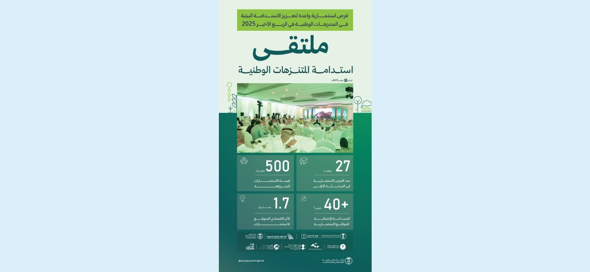 كشف المركز الوطني لتنمية  الغطاء النباتي  ومكافحة التصحر، عن طرح استثمارات نوعية لتعزيز الاستدامة البيئية في المتنزهات الوطنية، بقيمة تصل إلى 500 مليون ريال، على مساحة إجمالية تتجاوز ٤٠ مليون متر مربع، تشمل ٢٧ موقعًا استثماريًا في المرحلة الأولى، بما يُسهم في تعزيز النمو الاقتصادي، ودعم الجهود الوطنية لتحقيق أهداف مبادرة السعودية الخضراء للوصول إلى بيئة مزدهرة واقتصاد مستدام، تماشيًا مع مستهدفات رؤية السعودية 2030.