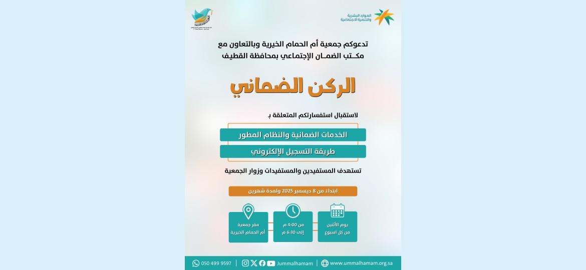 أطلقت جمعيّة أمّ الحمام الخيريّة مبادرة الركن الضمانيّ داخل مقرّها، وذلك بالشراكة مع مكتب الضمان الاجتماعيّ بمحافظة القطيف، في خطوة تهدف إلى تعزيز وصول المستفيدين إلى خدمات الضمان وتسهيل الإجراءات المرتبطة بالنظام المطوّر.