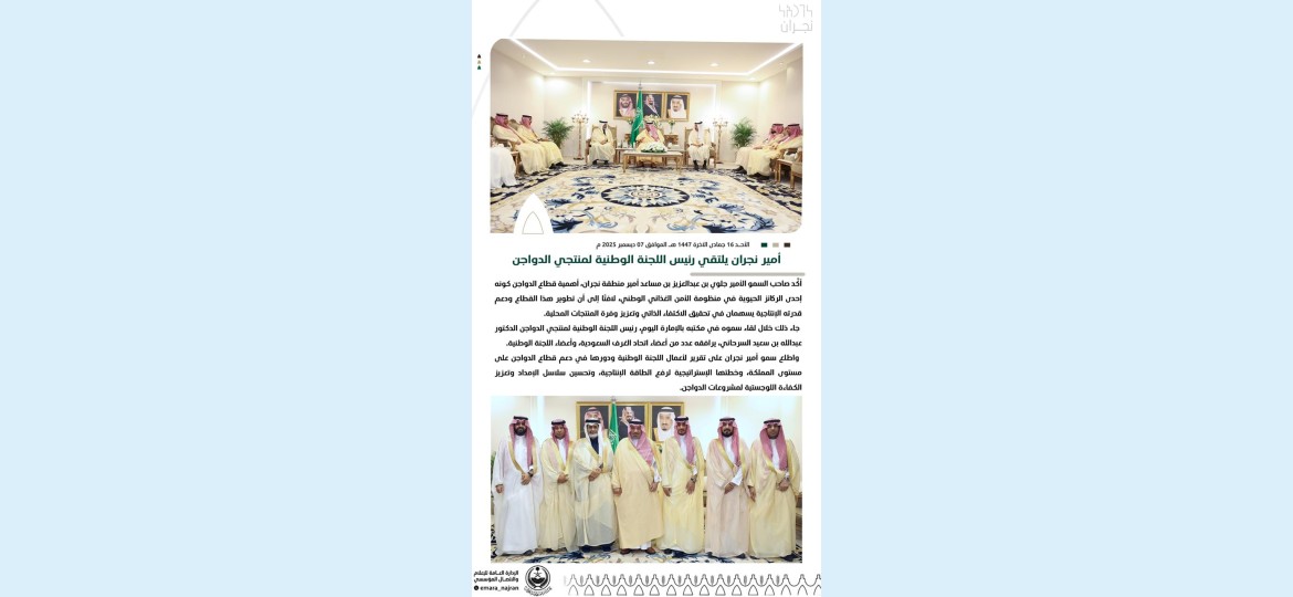 أكَّد صاحب السمو الأمير جلوي بن عبدالعزيز بن مساعد أمير منطقة نجران، أهمية قطاع الدواجن كونه إحدى الركائز الحيوية في منظومة الأمن الغذائي الوطني، لافتًا إلى أن تطوير هذا القطاع ودعم قدرته الإنتاجية يسهمان في تحقيق الاكتفاء الذاتي وتعزيز وفرة المنتجات المحلية.