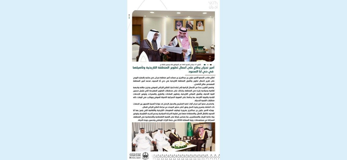 اطلع صاحب السمو الأمير جلوي بن عبدالعزيز بن مساعد أمير منطقة نجران, في مكتبه بالإمارة اليوم، على تقرير لأعمال تطوير وتأهيل المنطقة التاريخية في حي أبا السعود، قدمه أمين المنطقة المهندس صالح الغامدي.