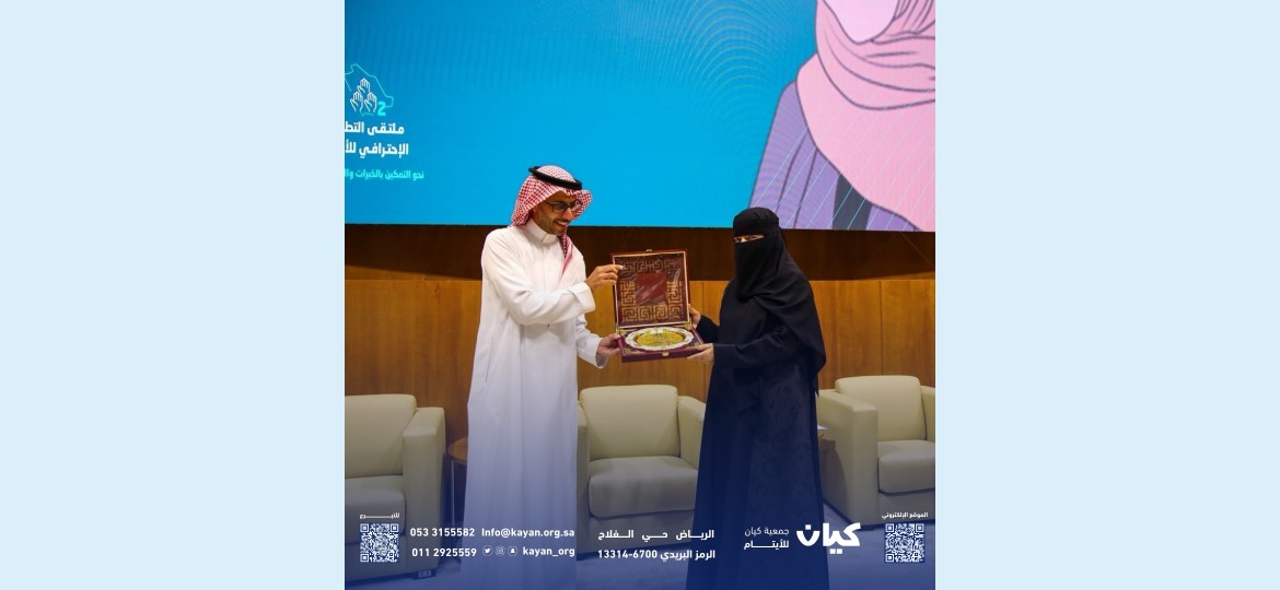 وخلال فعاليات الملتقى، قامت مؤسسة "إخاء" بتكريم الأستاذة سمها الغامدي رئيس مجلس إدارة جمعية كيان كأحد رموز العطاء الذين أسهموا في خدمة الأيتام ودعم العمل الخيري والإنساني.