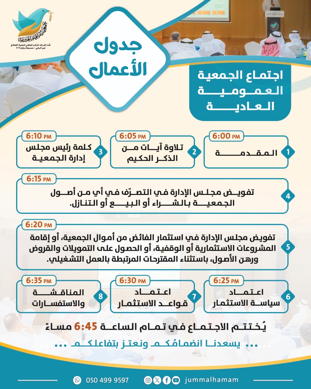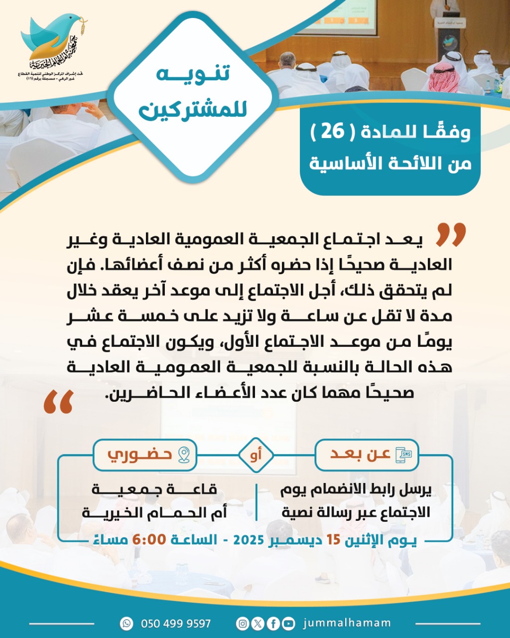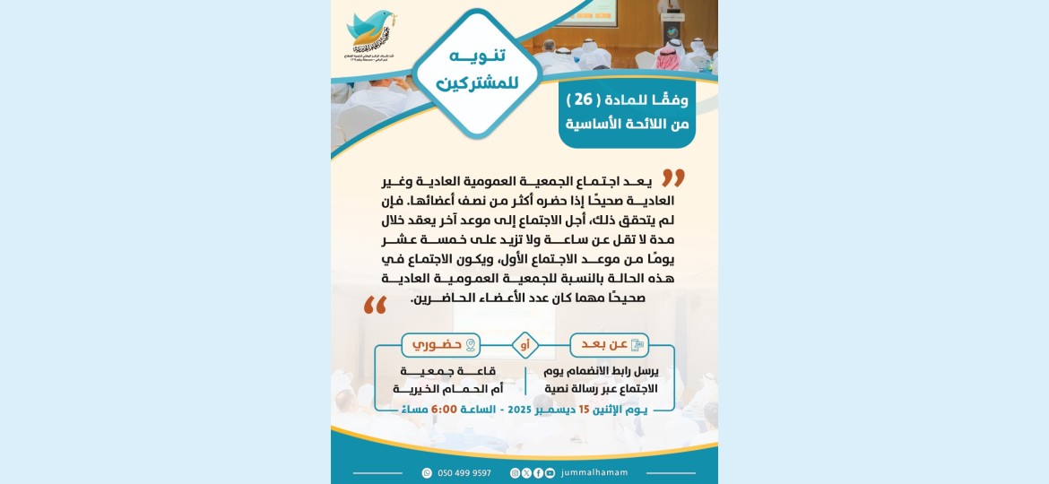 تعلن جمعيّة أمّ الحمام الخيريّة عن عقد اجتماع الجمعيّة العموميّة العاديّة لأعضائها العاملين الّذين جدّدوا اشتراكاتهم السنويّة أو مضى على عضويّتهم ستة أشهر، وذلك يوم الإثنين 24 جمادى الآخرة 1447هـ الموافق 15 ديسمبر 2025م، عند الساعة 6:00 مساءً، حيث سيعقد الاجتماع عن بُعد عبر رابط يتم إرساله للأعضاء برسالة نصيّة يوم الاجتماع، أو حضوريًّا في مقرّ الجمعيّة للرّاغبين.