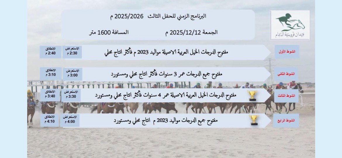 الميدان بدوره وجه الدعوة للجمهور الكريم وعشّاق رياضة الخيل والفروسية إلى حضور هذا البرنامج الرياضي والاستمتاع بأجواء السباق والتفاعل مع الفرسان والملاك، مؤكدة أن أبواب الميدان ستكون مفتوحة للجميع، اعتباراً من الساعة الثانية ظهراً، وأن الفعالية ستتضمن مجموعة من الأنشطة المرافقة المناسبة للعائلات ومحبي الفروسية.