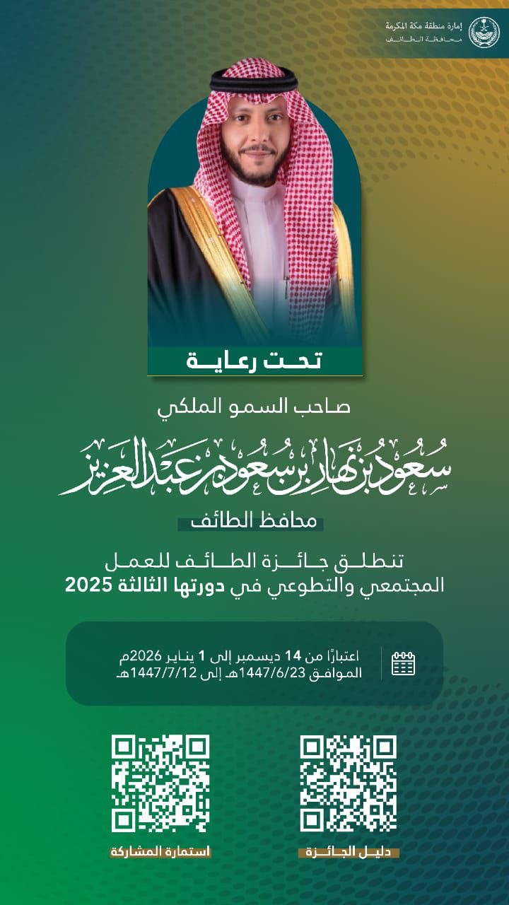 أطلق صاحب السمو الملكي الأمير سعود بن نهار بن سعود بن عبدالعزيز محافظ الطائف، جائزة الطائف للعمل المجتمعي والتطوعي في دورتها الثالثة لعام 2025م؛ بهدف دعم المبادرات ذات الأثر وتعزيز حضور العمل التطوعي في المجتمع.