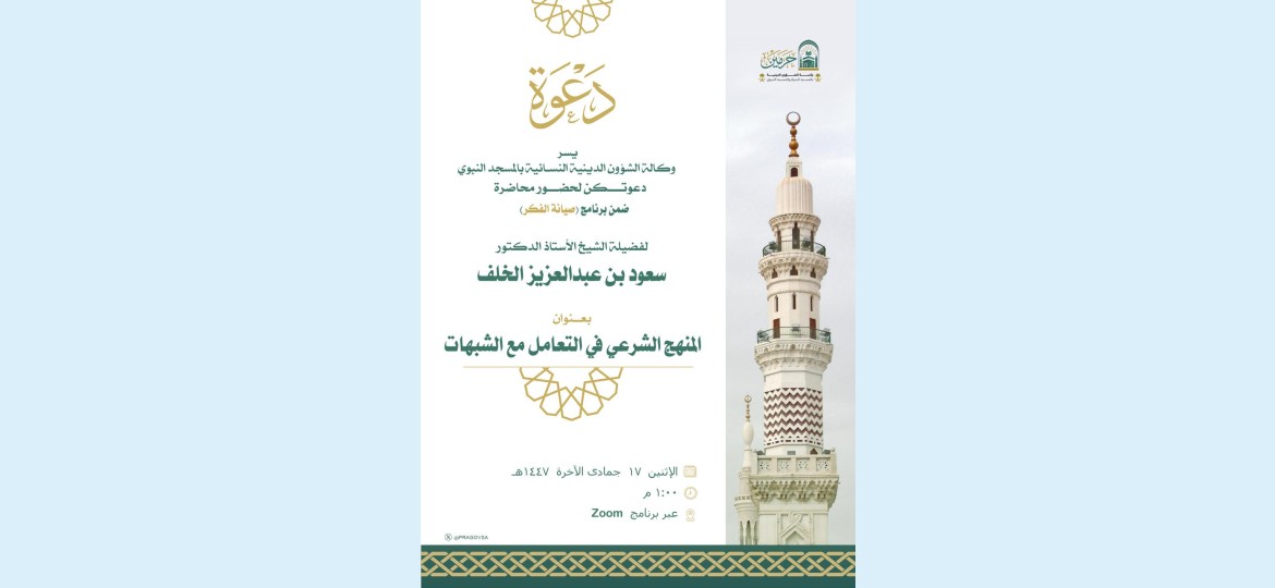 تواصل وكالة الشؤون الدينية النسائية في المسجد النبوي تنفيذ الخطة التشغيلية وتفعيل المبادرات في المصليات النسائية، حيث تم تنفيذ محاضرة بعنوان: (المنهج الشرعي في التعامل مع الشبهات) لفضيلة الشيخ الأستاذ الدكتور سعود بن عبدالعزيز الخلف -حفظه الله تعالى-.