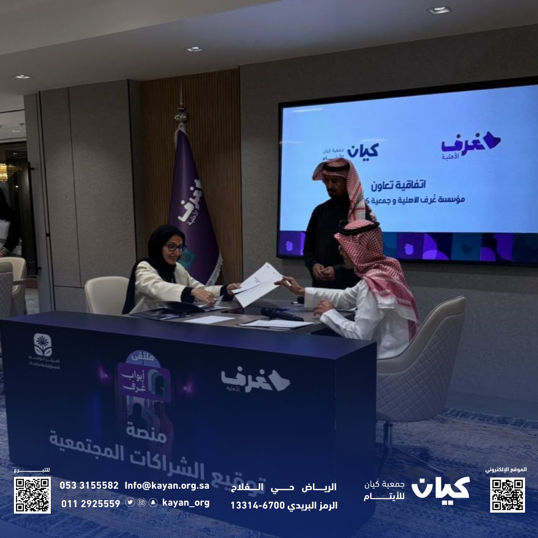 وقد وقّعت الاتفاقية عن جمعية كيان للأيتام الأستاذة ندى عبد الله القنيبط المدير التنفيذي للجمعية، فيما مثّل مؤسسة غُرف الأهلية في التوقيع الأستاذ محمد الغامدي المدير التنفيذي للمؤسسة، حيث جرى التوقيع في مقر مؤسسة غُرف بعد تلاقي رغبات الطرفين وتوافق رؤيتهما نحو تحقيق أثر اجتماعي فاعل.