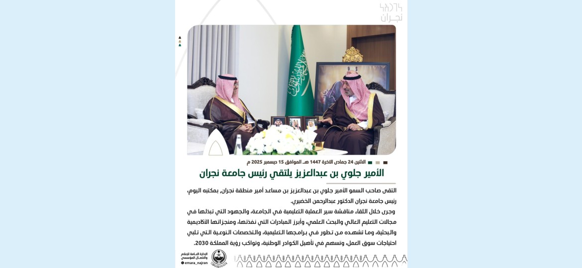 التقى صاحب السمو الأمير جلوي بن عبدالعزيز بن مساعد أمير منطقة نجران, بمكتبه اليوم، رئيس جامعة نجران الدكتور عبدالرحمن الخضيري.