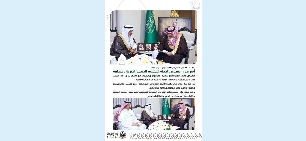 استعرض صاحب السمو الأمير جلوي بن عبدالعزيز بن مساعد أمير منطقة نجران رئيس مجلس إدارة الجمعية الخيرية بالمنطقة، الخطة التنفيذية المستقبلية للجمعية.