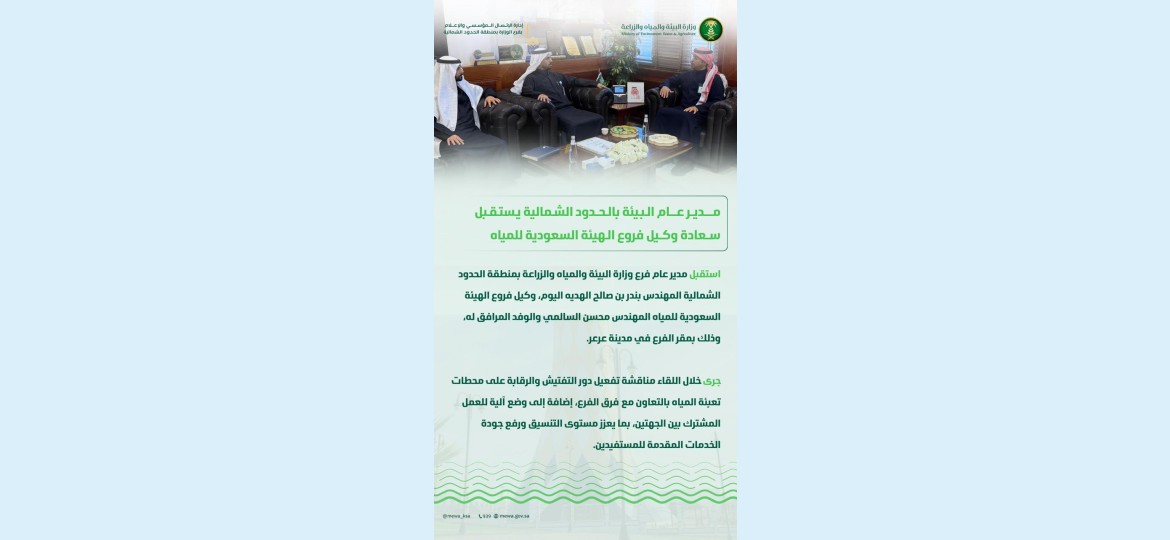 استقبل مدير عام فرع وزارة البيئة والمياه والزراعة بمنطقة الحدود الشمالية المهندس بندر بن صالح الهديه اليوم، وكيل فروع الهيئة السعودية للمياه المهندس محسن السالمي والوفد المرافق له، وذلك بمقر الفرع في مدينة عرعر.
