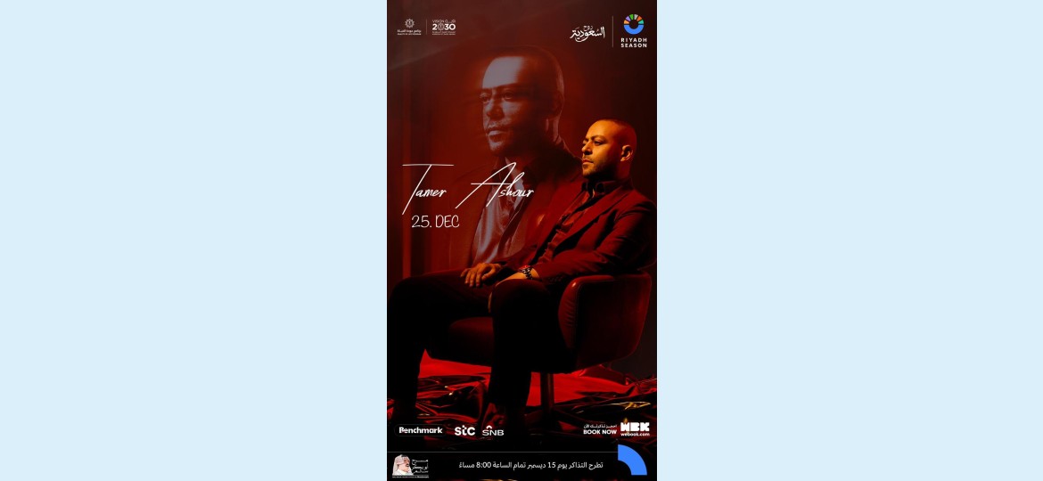 يلتقي الفنان تامر عاشور جمهوره في العاصمة الرياض من خلال حفل غنائي منتظر ضمن حفلات موسم الرياض، وذلك يوم 25 ديسمبر، بتنظيم شركة بنش مارك.