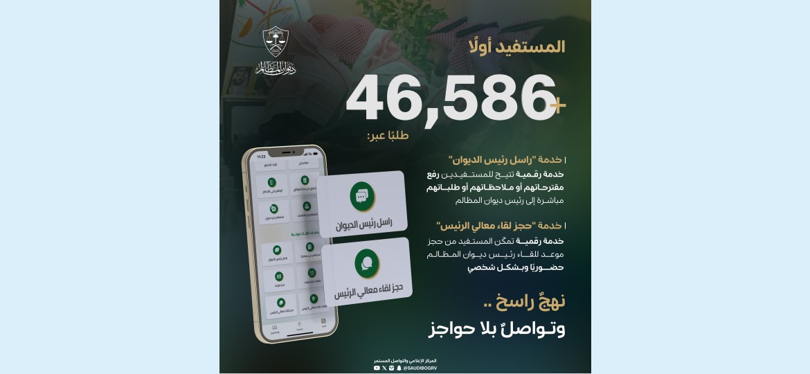 ضمن جهوده المستمرة في تحسين تجارب المستفيدين وتطوير منظومة التواصل المباشر مع المسؤول الأول، أعلن ديوان المظالم ممثلًا في مكتب الخدمات القضائية الرقمية أن عدد الطلبات والمراسلات الواردة عبر خدمتي حجز موعد لقاء رئيس ديوان المظالم وراسل رئيس ديوان المظالم قد بلغ 46,586 طلبًا منذ تفعيل الخدمتين رقميًا مطلع عام 2020، ويأتي ذلك تعزيزًا لسهولة وصول المستفيدين لقيادة الديوان وتمكينهم من رفع ملاحظاتهم ومقترحاتهم بكل يُسر.