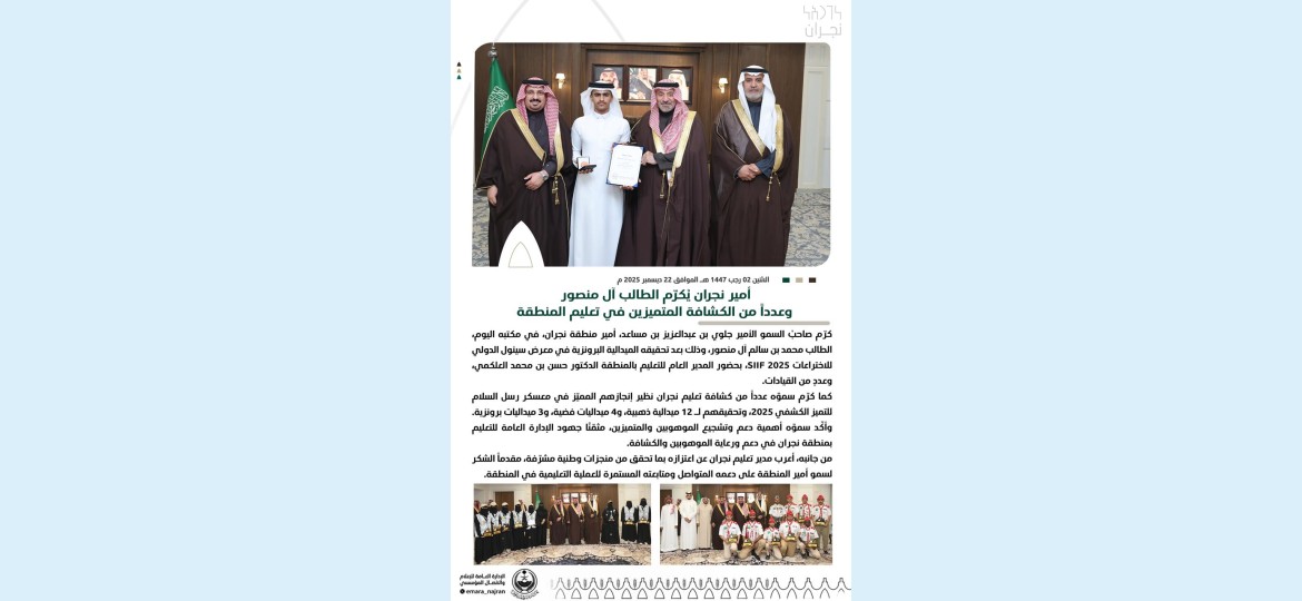 كما كرّم سموّه عدداً من كشافة تعليم نجران نظير إنجازهم المميّز في معسكر رسل السلام للتميز الكشفي 2025، وتحقيقهم لـ 12 ميدالية ذهبية، و4 ميداليات فضية، و3 ميداليات برونزية.