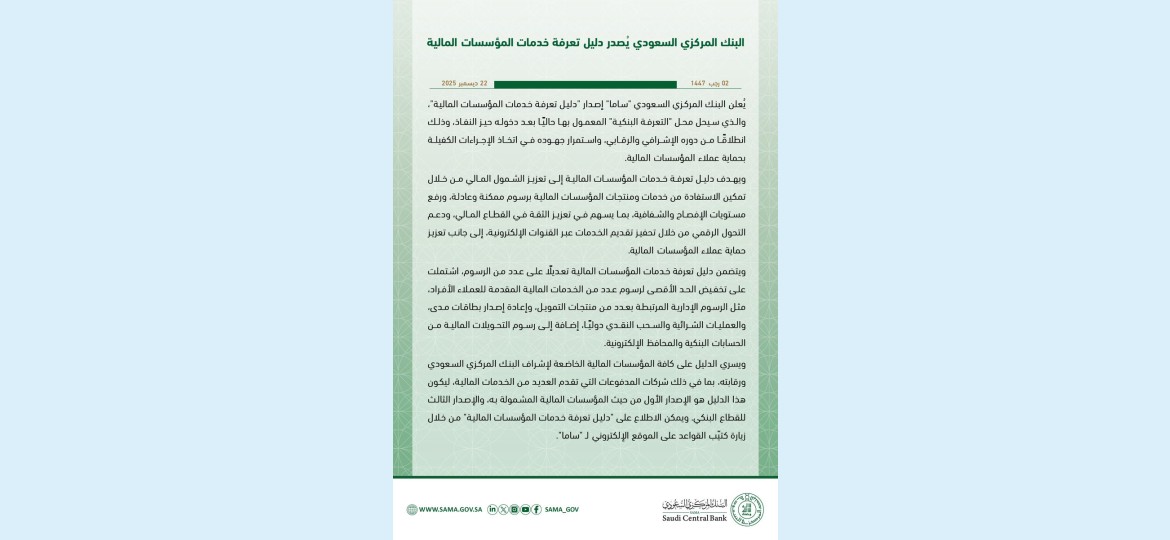 يُعلن البنك المركزي السعودي "ساما" إصدار "دليل تعرفة خدمات المؤسسات المالية"، والذي سيحل محل "التعرفة البنكية" المعمول بها حاليًا بعد دخوله حيز النفاذ، وذلك انطلاقًا من دوره الإشرافي والرقابي، واستمرار جهوده في اتخاذ الإجراءات الكفيلة بحماية عملاء المؤسسات المالية.