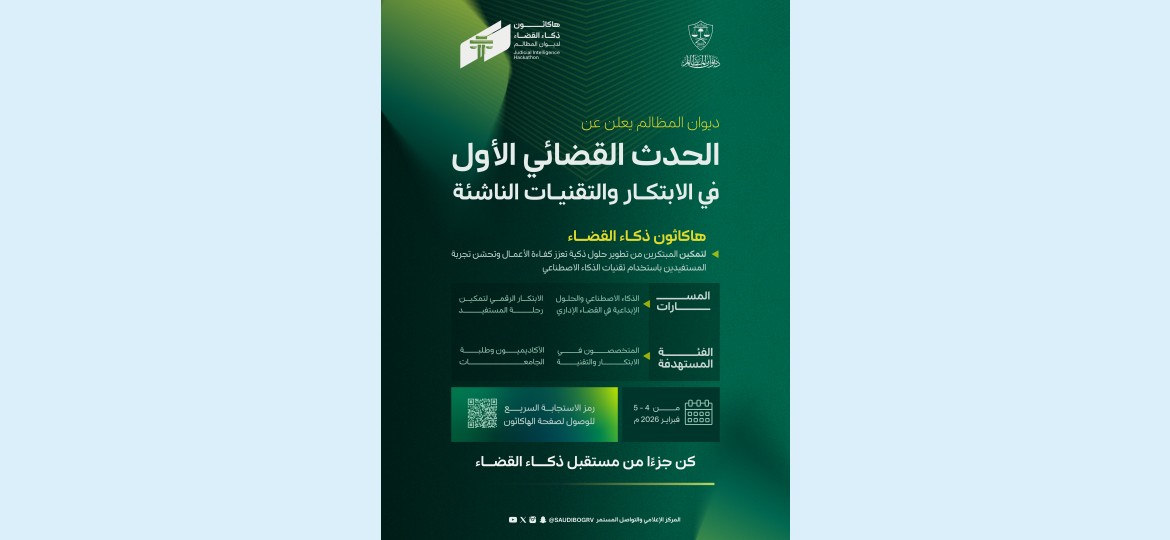 أعلن ديوان المظالم عن فتح باب التسجيل في هاكاثون "ذكاء القضاء" والذي يعقد للمرة الأولى للمنافسة على أفضل الأفكار الابتكارية في الحلول والاستراتيجيات المستدامة للاستفادة من التقنيات الحديثة في تعزيز كفاءة الإجراءات القضائية بديوان المظالم وإدارتها، وتيسير الأعمال بين دوائره وإداراته، وتجويد نواتجه القضائية والتنظيمية، حيث حدد ديوان المظالم يوم الأحد 28 ديسمبر 2025م موعدًا لبدء فترة التسجيل في الهاكاثون، والتي تمتد حتى 20 يناير 2026م، بهدف دعم المواهب وتشجيع الابتكارات في مجالي الرقمنة والذكاء الاصطناعي.