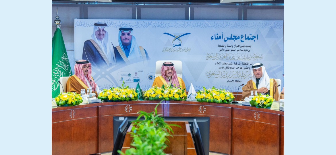 يرأس صاحب السمو الملكي الأمير سعود بن نايف بن عبدالعزيز، أمير المنطقة الشرقية، رئيس مجلس أمناء جمعية قبس للقرآن والسنة والخطابة، غدًا الإثنين ، الاجتماع الثامن لمجلس أمناء الجمعية، وذلك في إطار دعم سموه المتواصل لرسالة الجمعية وبرامجها النوعية، بحضور صاحب السمو الملكي الأمير سعود بن طلال بن بدر، محافظ الأحساء، وسمو نائب رئيس مجلس الأمناء والمشرف العام على الجمعية الأمير عبدالعزيز بن محمد بن فهد بن جلوي، وعدد من أصحاب السمو والمعالي والفضيلة أعضاء المجلس.