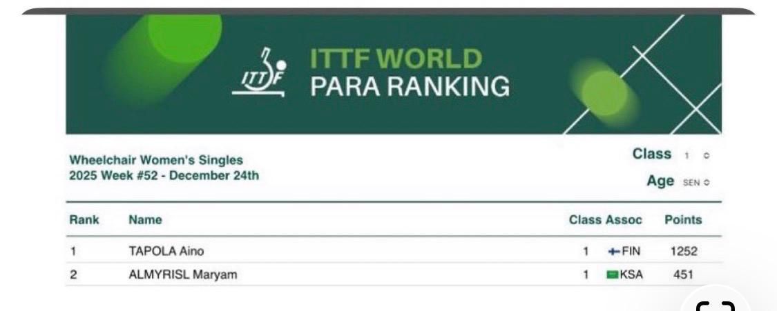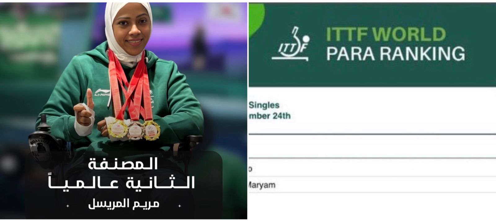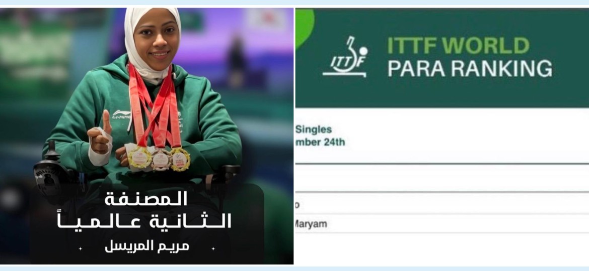 حققت لاعبة المنتخب السعودي لكرة الطاولة مريم المريسل إنجازًا عالميًا جديدًا بعد حصولها على التصنيف الثاني عالميًا في منافسات البارالمبية – الفئة (Class 1)، في إنجاز يُضاف إلى سجل الرياضة السعودية ويؤكد حضور المملكة في أعلى مصاف الدول المتقدمة رياضيًا.
