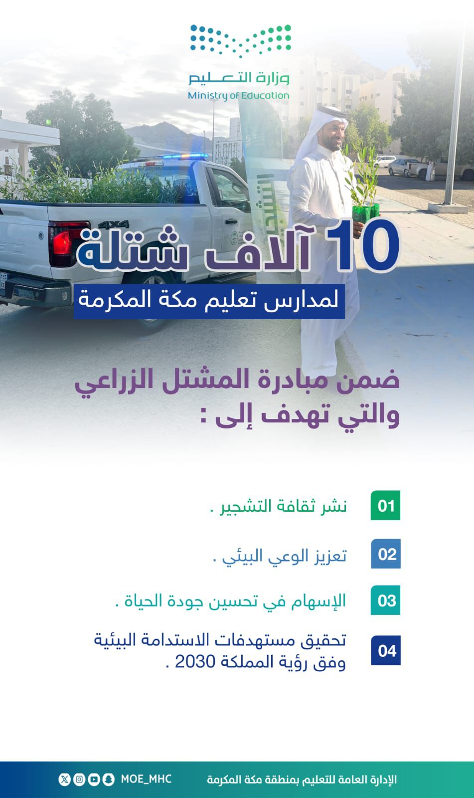 أطلقت الإدارة العامة للتعليم بمنطقة مكة المكرمة، ممثلة في قسم المسؤولية المجتمعية، مبادرة "المشتل الزراعي"؛ بهدف تحسين البيئة المدرسية وتعزيز أنسنة المباني التعليمية، من خلال توفير أكثر من 10,000 شتلة لتوزيعها على مدارس المنطقة.