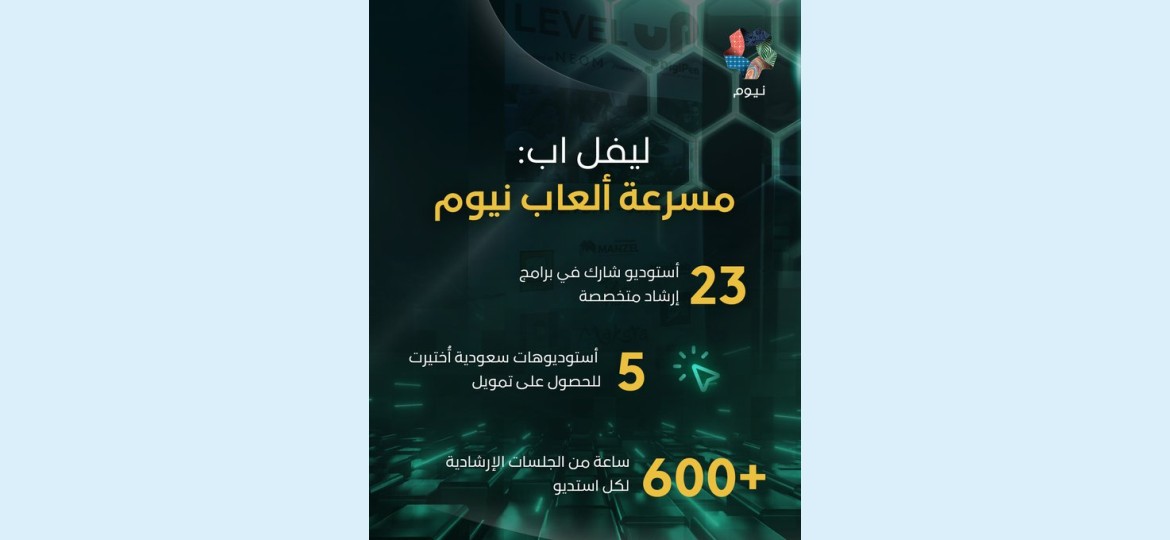 وتُعد"ليفل أب" التي تشرف عليها إدارة الألعاب الإلكترونية في نيوم، المسرّعة الأكثر رسوخاً واستمرارية في المملكة، وإحدى المبادرات المحورية ضمن الاستراتيجية الوطنية للألعاب والرياضات الإلكترونية المنبثقة عن رؤية السعودية 2030.