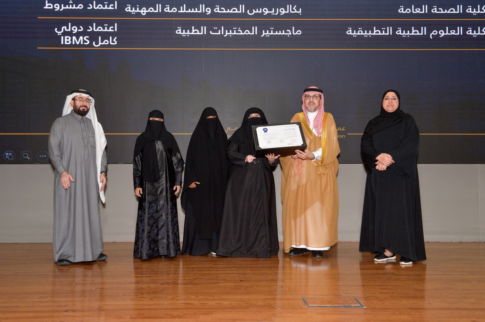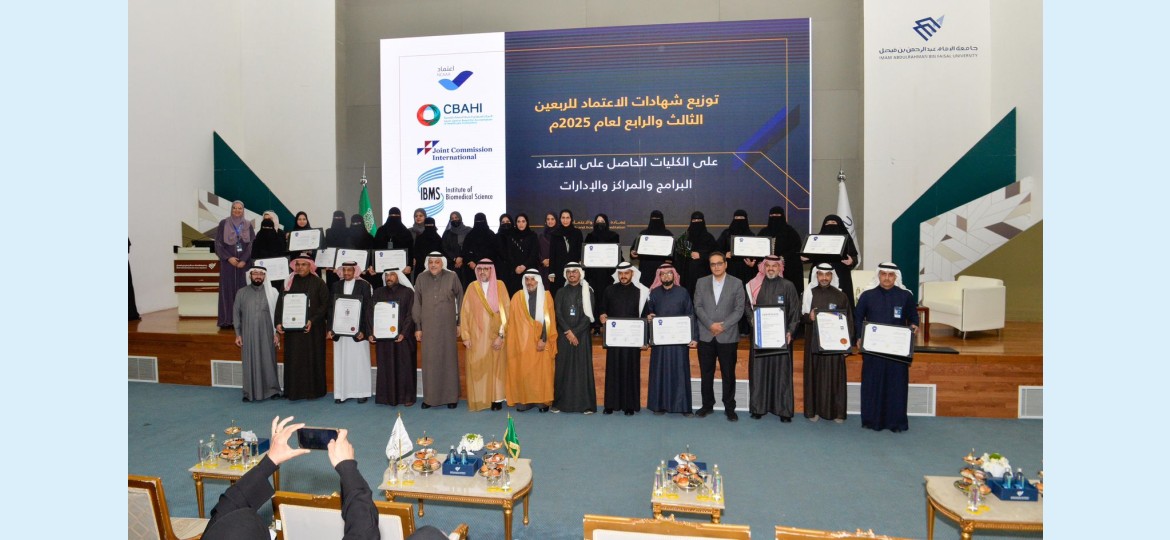 برعاية سعادة رئيس جامعة الإمام عبدالرحمن بن فيصل الأستاذ الدكتور فهد بن أحمد الحربي سلّم نائب الرئيس للتطوير والشراكة المجتمعية الأستاذ الدكتور عاصم بن عبدالرحمن الانصاري شهادات الاعتماد للبرامج والمراكز والإدارات بحضور المدير التنفيذي للمدينة الطبية الدكتور سعد العمري و بمشاركة الدكتور ناصر السرحان مستشار ضمان الجودة والاعتماد الاكاديمي وحضور عميد عمادة الجودة والاعتماد الاكاديمي بالجامعة الأستاذ الدكتور أحمد بن عبد الله الكويتي وحضور عمداء الكليات والمراكز الإدارات الذين حققوا الاعتماد و جاء ذلك ضمن فعاليات واعمال ملتقى غلق دائرة الجودة في البرامج الأكاديمية التي تنظمه عمادة الجودة والاعتماد الأكاديمي بالجامعة.