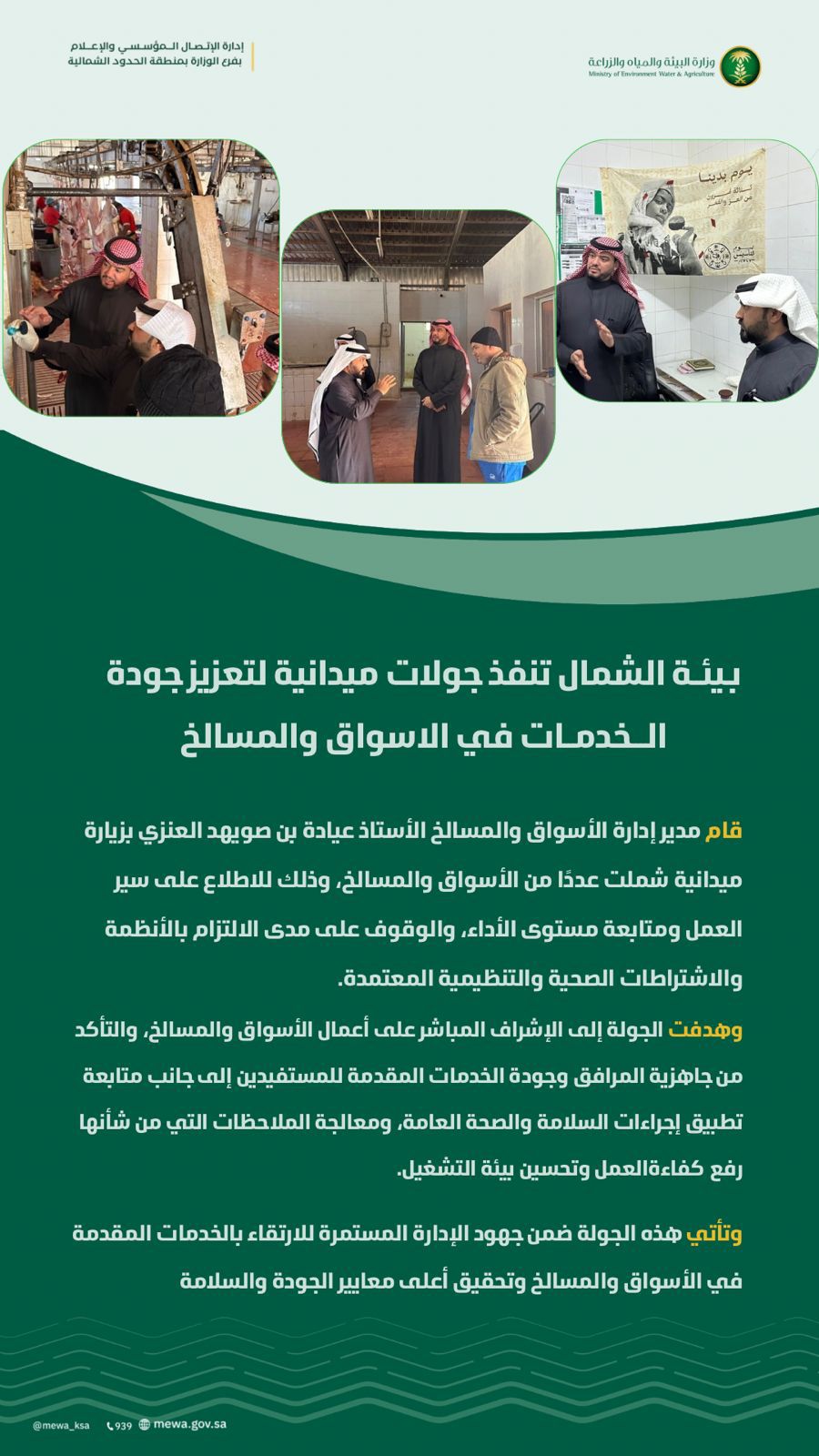 وتأتي هذه الجولة ضمن جهود الإدارة المستمرة للارتقاء بالخدمات المقدمة في الأسواق والمسالخ، وتحقيق أعلى معايير الجودة والسلامة.