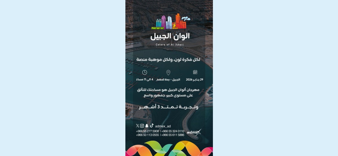 تستعد مدينة الجبيل لتعزيز مكانتها كوجهة سياحية رائدة في المنطقة الشرقية، مع إعلان شركة “ادمكس” (ADMEX) عن اختيار “مارينا الجبيل باي” مقراً لانطلاق مهرجانها المرتقب #مهرجان_الوان_الجبيل في 29 يناير الجاري.