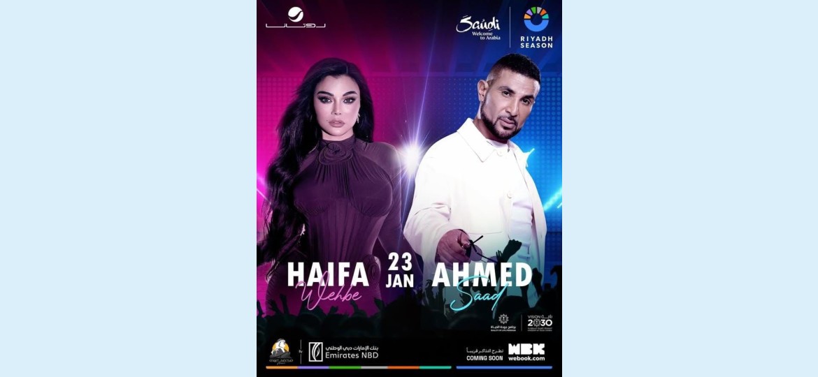 تستعد العاصمة السعودية الرياض لاحتضان أمسية فنية استثنائية يحييها النجمان هيفاء وهبي وأحمد سعد، وذلك يوم 23 يناير، ضمن فعاليات موسم الرياض، في حفل يُنتظر أن يشهد حضورًا جماهيريًا واسعًا وأجواءً طربية نابضة بالإبداع.