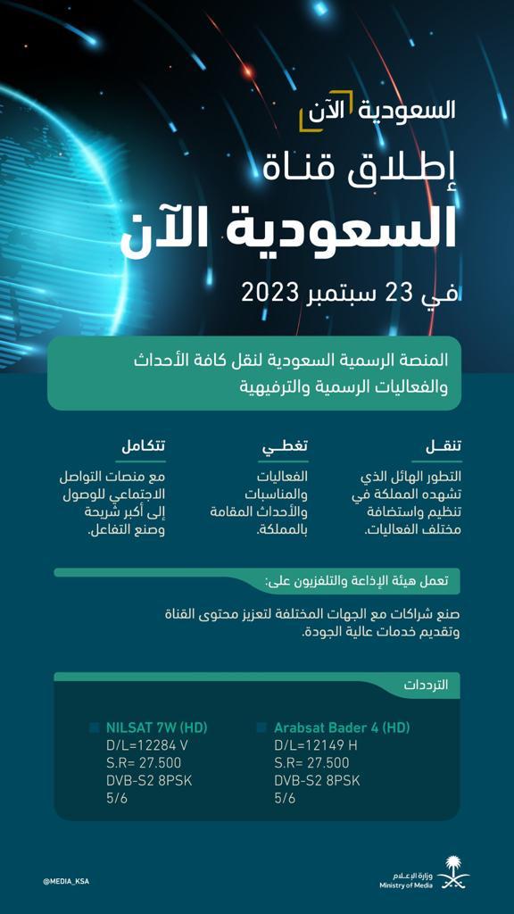 تُطلق هيئة الإذاعة والتلفزيون قناة "السعودية الآن" في 23 سبتمبر 2023، بالتزامن مع الاحتفالات باليوم الوطني 93، لتكون مواكبة الأحداث الكبرى والفعاليات التي تستضيفها المملكة.