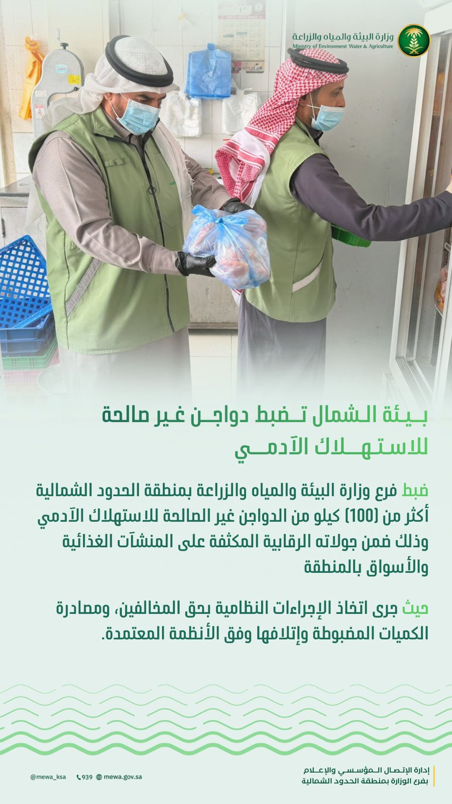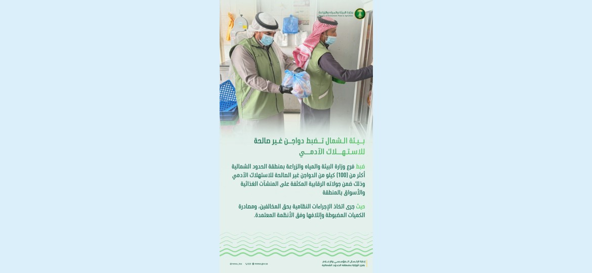 ضبط فرع وزارة البيئة والمياه والزراعة بمنطقة الحدود الشمالية أكثر من (100) كيلو من الدواجن غير الصالحة للاستهلاك الآدمي ، وذلك ضمن جولاته الرقابية المكثفة على المنشآت الغذائية والأسواق بالمنطقة.