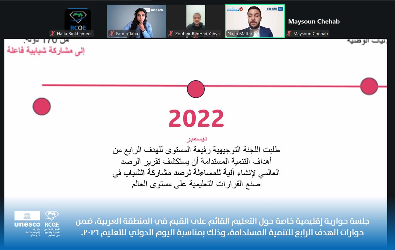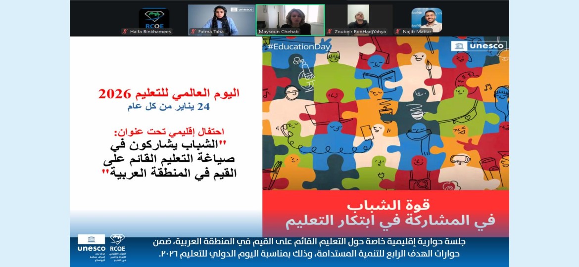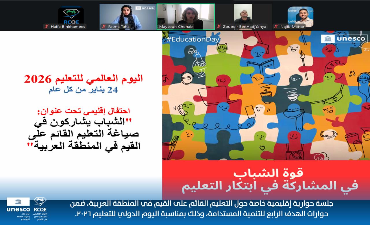 تنطلق جلسة حوارية إقليمية خاصة حول التعليم القائم على القيم في المنطقة العربية، ضمن فعاليات حوارات الهدف الرابع للتنمية المستدامة وبمناسبة اليوم الدولي للتعليم 2026، في خطوة تهدف إلى تعزيز دور التعليم في بناء مجتمعات أكثر سلامًا وعدلًا واستدامة.