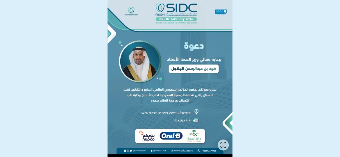 تحت رعاية معالي وزير الصحة الأستاذ فهد بن عبدالرحمن الجلاجل، تنظم الجمعية السعودية لطب الأسنان بالتعاون مع كلية طب الأسنان بجامعة الملك سعود المؤتمر الدولي السنوي في نسخته السابعة والثلاثين، وذلك خلال الفترة من 5 إلى 7 فبراير 2026م في واجهة روشن للمعارض والمؤتمرات بمدينة الرياض، بمشاركة واسعة من الخبراء والمتخصصين والشركات الرائدة في قطاع طب الأسنان من داخل المملكة وخارجها.