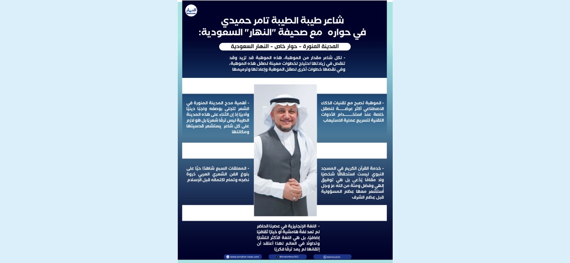 ويأتي هذا اللقاء مع الدكتور تامر إسماعيل حميدي لـصحيفة "النهار" السعودية، ليتناول قضايا صقل الموهبة الشعرية وبنائها على أسس معرفية ومنهجية، مستندًا إلى التراث الأدبي العربي، ومقاربًا أدوات الإبداع بلغة تعليمية واضحة.