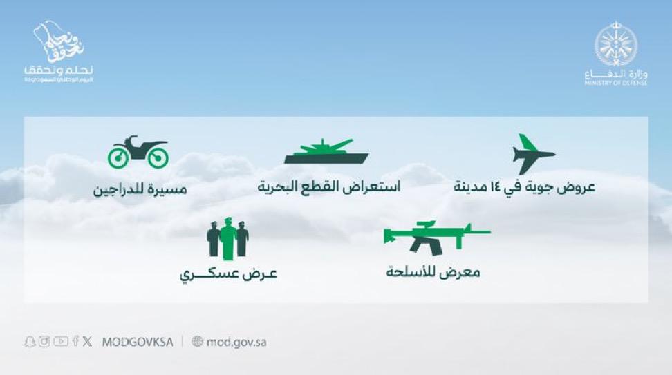 تشارك وزارة الدفاع بحزمة من الفعاليات والأنشطة المتنوعة للاحتفاء باليوم الوطني الـ 93، في مقدمتها العروض الجوية والبحرية التي ستقام في عدد من مناطق المملكة.
