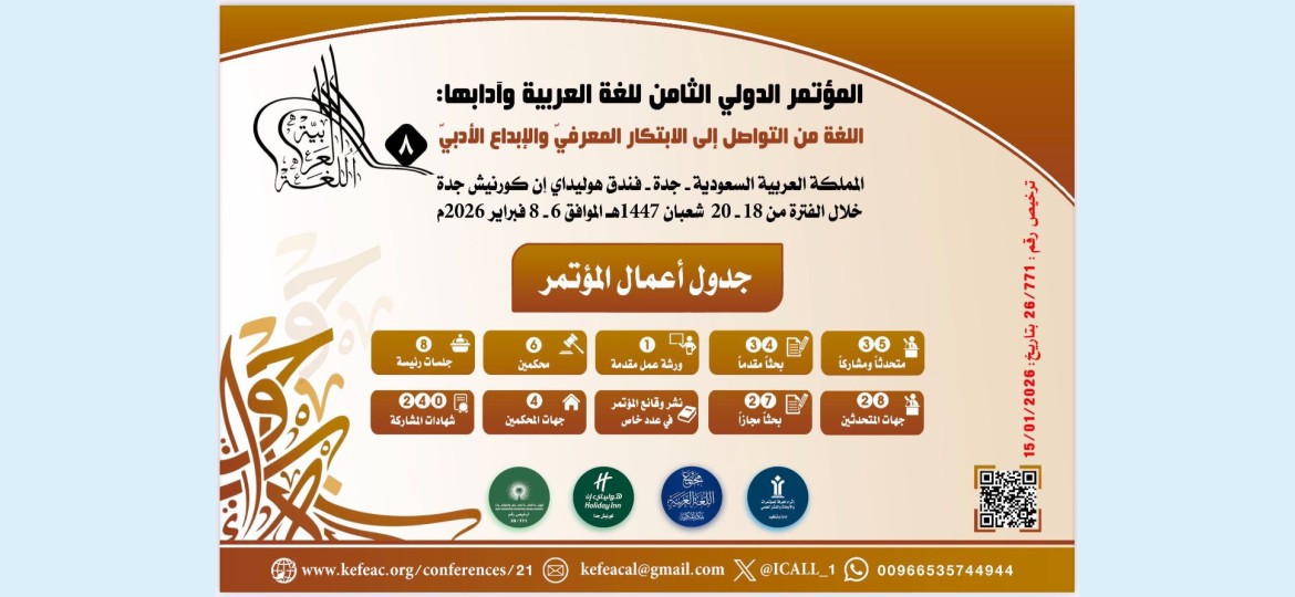 تنطلق فعاليات المؤتمر الدولي الثامن للغة العربية وآدابها: "اللغة من التواصل إلى الابتكار المعرفيّ والإبداع الأدبيّ"، في مدينة جدة، وذلك بفندق هوليداي إن كورنيش جدة، خلال الفترة 18–20 شعبان 1447هـ، تحت مظلة الهيئة العامة للمعارض والمؤتمرات.