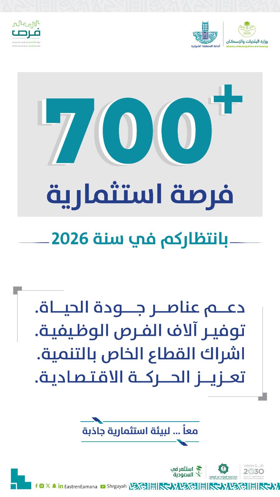 أطلقت أمانة المنطقة الشرقية خطتها لطرح أكثر من 700 فرصة استثمارية دائمة ومؤقتة خلال عام 2026 في كافة المدن والمحافظات بالمنطقة الشرقية، تغطي أكثر من 18 نشاطاً كالسياحة والترفيه والرياضة والتعليم والصناعة والصحة والتعليم والايواء والبنية التحتية والخدمات والمنتزهات والحدائق والأنشطة البحرية والمرافق العامة والبيئة وانشطة متعددة مساندة، والتي تأتي امتداداً لجهودها في إشراك القطاع الخاص بالتنمية، بالتماشي مع رؤية السعودية 2030، ودعم عناصر جودة الحياة، والمساهمة في توفير الفرص الوظيفية لأبناء الوطن.