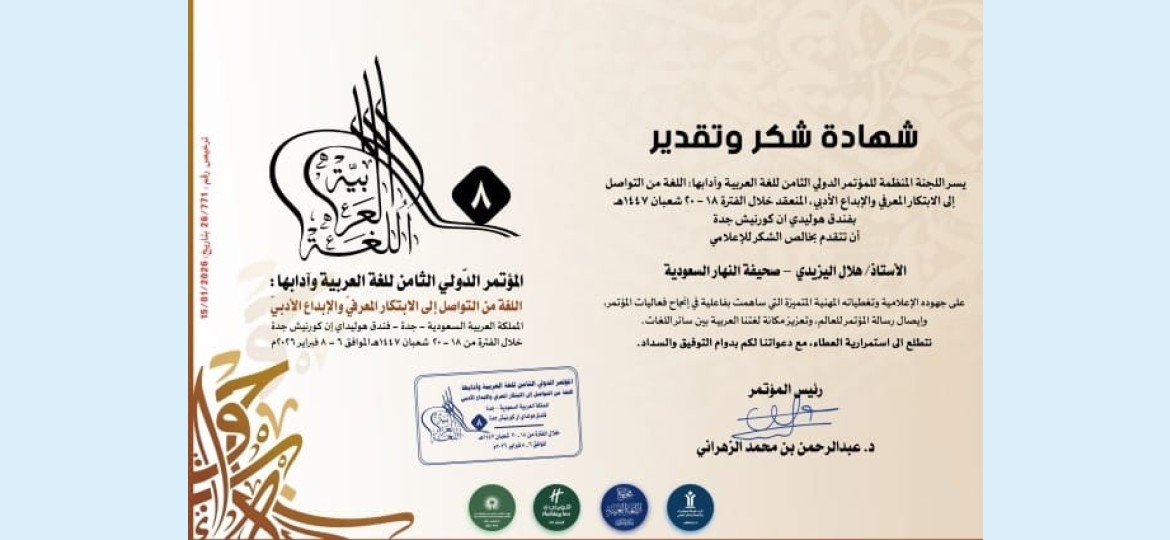 حصل محرر صحيفة النهار السعودية هلال اليزيدي على شهادة شكر وتقدير من اللجنة المنظمة لـ المؤتمر الدولي الثامن للغة العربية وآدابها، وذلك تقديرًا لجهوده الإعلامية وتغطياته المهنية التي ساهمت في إنجاح فعاليات المؤتمر.