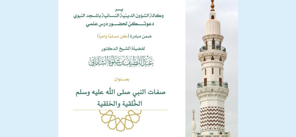 وكالة الشؤون الدينية النسائية في المسجد النبوي الشريف تواصل تنفيذ الخطة التشغيلية وتفعيل المحاضرات العلمية ضمن مبادرة (كن مسلما واعيا )، والتي قدمت من قبل فضيلة الشيخ الأستاذ الدكتور (عبداللطيف الشاماني) بعنوان ( صفات النبي صلى الله عليه وسلم الخُلقية والخلقية)