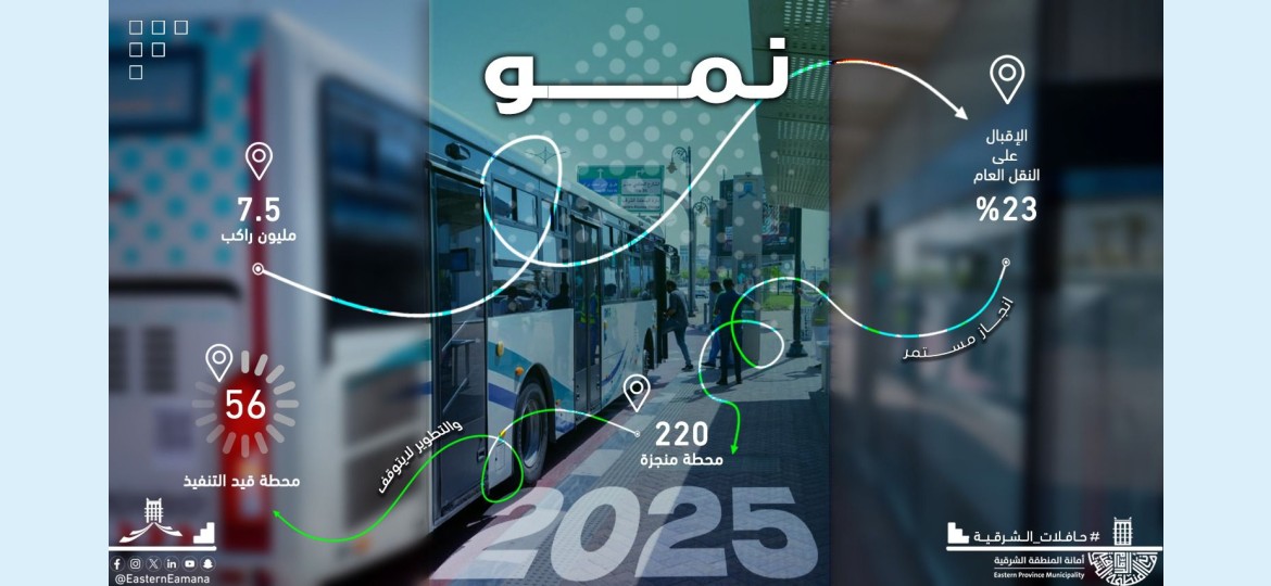 سجل النقل العام بحاضرة الدمام إنجازاً لافتاً يعكس التطور المتسارع في منظومة التنقل الحضري، حيث بلغ عدد مستخدمي حافلات النقل العام 7.5 مليون راكب بنهاية عام 2025م، في خطوة تعزز كفاءة الحركة وترسخ مفاهيم النقل المستدام، كما بلغت نسبة النمو في الإقبال على النقل العام بلغت %23 مقارنة بعام 2024م، مع تشغيل ما يقارب 973 رحلة يومياً، بما يعكس ثقة المجتمع في خدمات النقل العام الحديثة.