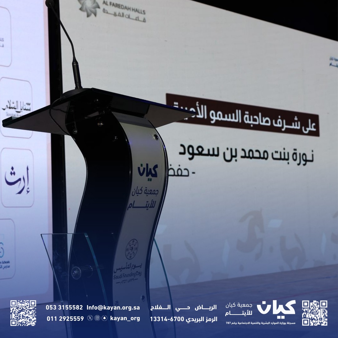 رعت حرم أمير الرياض، صاحبة السمو الأميرة نورة بنت محمد بن سعود بن عبد الرحمن آل سعود، احتفال جمعية كيان للأيتام ذوي الظروف الخاصة بيوم التأسيس تحت شعار «يوم بدينا»، والذي أقيم مساء أمس في الفريدة، بحضور الأستاذة سمها بنت سعيد الغامدي رئيس مجلس الإدارة، وعضوات المجلس، والإدارة التنفيذية، وكبار الشخصيات، والموظفات، والأسر البديلة، ومستفيدي كيان، في احتفاء وطني جسّد مشاعر الانتماء والفخر بالهوية السعودية وتاريخ الدولة الممتد لثلاثة قرون.