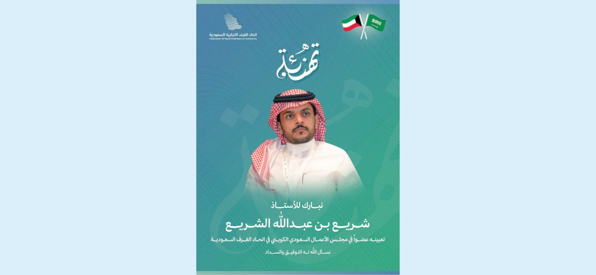 أعلن اتحاد الغرف السعودية عن تعيين الأستاذ شريع بن عبدالله الشريع، الرئيس التنفيذي لـمجموعة الأعمال الوطنية، عضواً في مجلس الأعمال السعودي-الكويتي، وذلك في إطار تعزيز التعاون الاقتصادي والتجاري بين المملكة العربية السعودية ودولة الكويت.