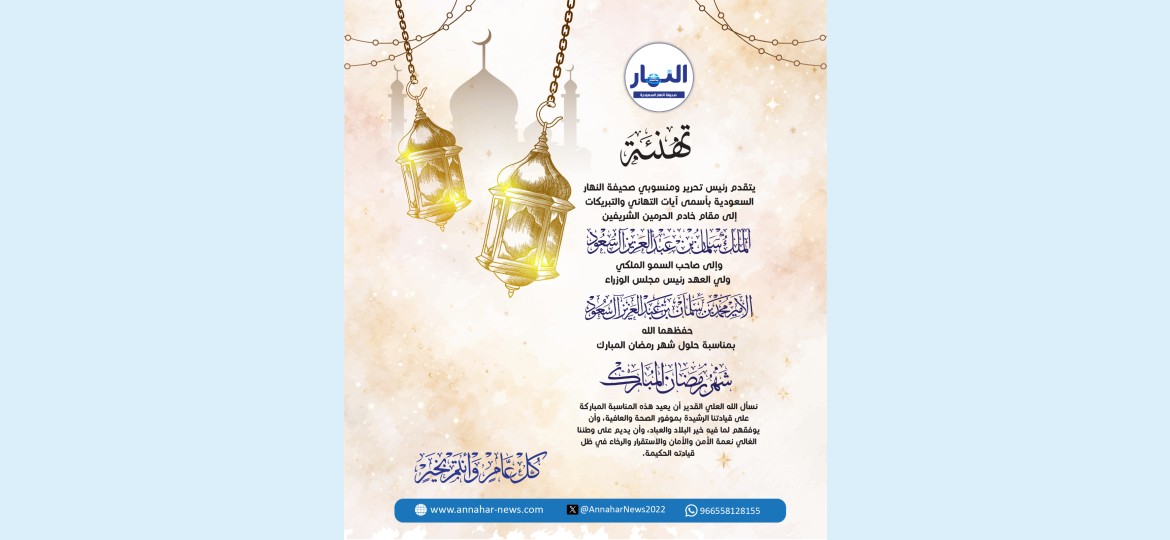 يتقدم رئيس تحرير ومنسوبي صحيفة النهار السعودية بأسمى آيات التهاني والتبريكات إلى مقام خادم الحرمين الشريفين الملك سلمان بن عبدالعزيز آل سعود ، وإلى صاحب السمو الملكي ولي العهد رئيس مجلس الوزراء الأمير محمد بن سلمان بن عبدالعزيز آل سعود – حفظهما الله – بمناسبة حلول شهر رمضان المبارك.