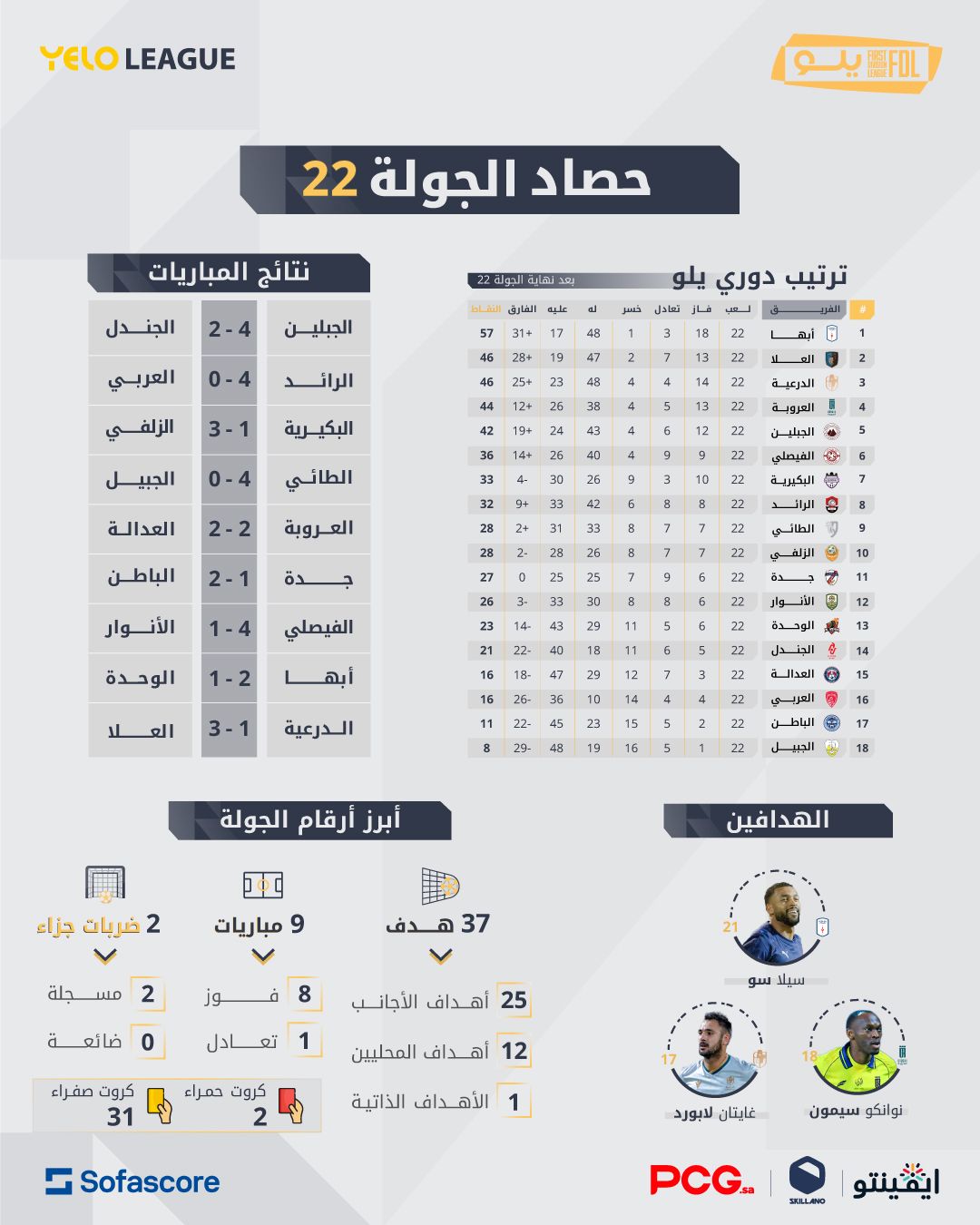أُسدل الستار على منافسات الجولة 22 من دوري يلو للمحترفين، والتي جاءت تاريخية من حيث الغلة التهديفية، تقاسمها اللاعبون الأجانب بـ 25 هدفاً والمحليون بـ 12 هدفاً، مع تسجيل ركلتي جزاء بنجاح وهدف عكسي واحد.