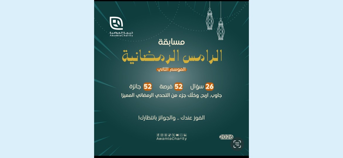 وتعد مسابقة “الرامس الرمضانية” إحدى المبادرات الإعلامية المبتكرة التي أطلقها القسم الإعلامي بالجمعية، بهدف تعزيز التفاعل المجتمعي، والتعريف ببرامج الجمعية وأنشطتها، وإيجاد مساحة تفاعلية تثري المحتوى الرمضاني بأسلوب معرفي تنافسي يسهم في ترسيخ القيم الإيجابية ويعزز الارتباط بالعمل الخيري.