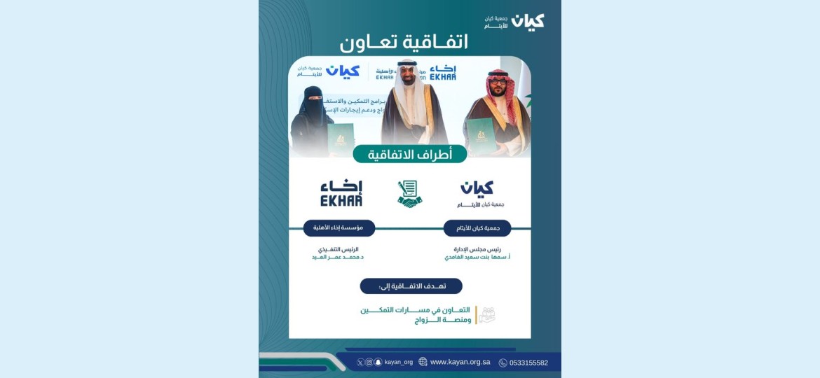 وتهدف الاتفاقية إلى تنظيم آلية التنسيق والتكامل بين الطرفين في التعامل مع حالات الأيتام ذوي الظروف الخاصة، ووضع إطار واضح لتبادل المعلومات، إلى جانب تعزيز التعاون في مجالات التمكين والتعليم والتأهيل والتدريب، ومنصة كيان للإرشاد الأسري والزواج، وتوحيد إجراءات التواصل والمتابعة بما يضمن سرعة وجودة الخدمات المقدمة.