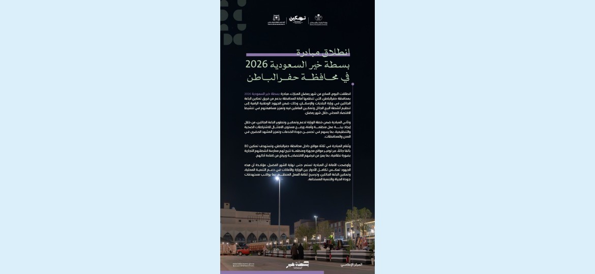 انطلقت اليوم، السابع من شهر رمضان المبارك، مبادرة “بسطة خير السعودية 2026” بمحافظة حفرالباطن، التي تنظمها أمانة المحافظة بدعم من فريق تمكين الباعة الجائلين في وزارة البلديات والإسكان، وذلك ضمن الجهود الوطنية الرامية إلى تنظيم أنشطة البيع الجائل وتمكين العاملين فيه وتعزيز مساهمتهم في تنشيط الاقتصاد المحلي خلال شهر رمضان.