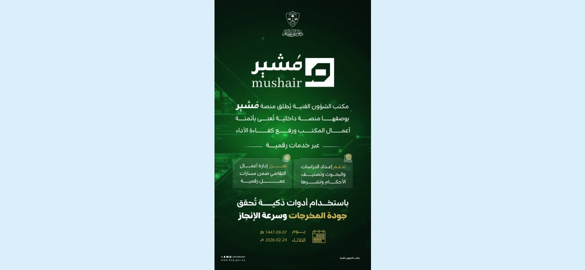 أعلن ديوان المظالم، ممثلًا في مكتب الشؤون الفنية، عن إطلاق منصة مُشير الرقمية، وهي إحدى مبادرات التحول الرقمي، وذلك عبر منصة داخلية خاصة بأعمال الشؤون الفنية في بوابة ديوان المظالم الرقمية، تُعنى بتنظيم وأتمتة أعمال أرشفة البيانات القضائية وتصنيفها وتيسير الرجوع إليها والاستفادة منها، بهدف تجويد مخرجات المكتب وتنظيم وإنجاز أعماله.