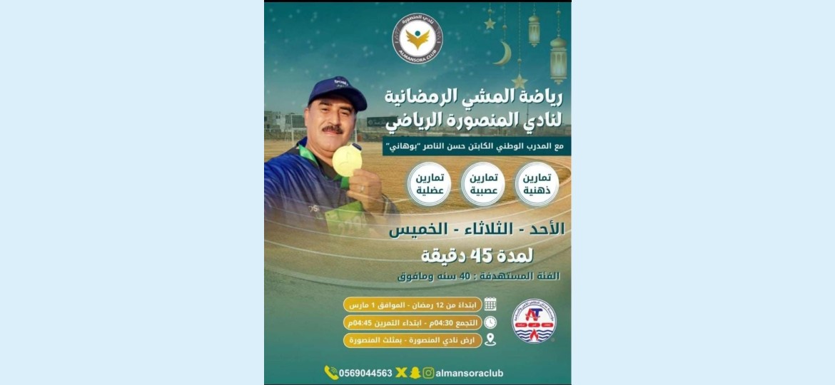 يقيم نادي المنصورة الرياضي فعالية رياضة المشي الرمضانية لمدة ثلاثة أيام، ابتداءً من 12 رمضان المبارك، وذلك في أيام الأحد والثلاثاء والخميس، ولمدة 45 دقيقة بقيادة الكابتن حسن الناصر، حيث ستقام الفعالية في منشأت نادي المنصورة الرياضي – مثلث المنصورة، ويعتبر هذا البرنامج ضمن برامج النادي الهادفة إلى لتعزيز نمط الحياة الصحية، ونشر ثقافة ممارسة رياضة المشي خلال الشهر الفضيل، وقد وجهت ادارة نادي المنصورة للجميع ممن يرغب الانخراط في هذا البرنامج للمشاركة والاستفادة، وتعد رياضة المشي من الرياضات المفيدة وبشكل كبير حيث انها تعود على الانسان بالصحة والفائدة الجسمية والنفسية جراء الممارسة اليومية وبخاصة في الاجواء الرمضانية الممزوجة بالمشاركات الاجتماعية من جميع فئات المجتمع.