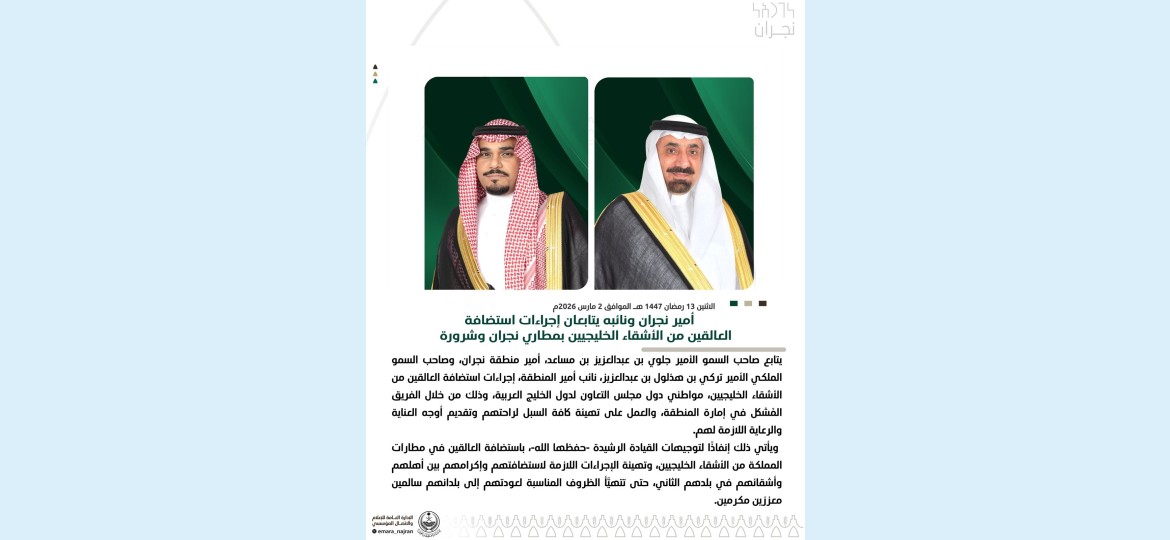 يتابع صاحب السمو الأمير جلوي بن عبدالعزيز بن مساعد، أمير منطقة نجران، وصاحب السمو الملكي الأمير تركي بن هذلول بن عبدالعزيز، نائب أمير المنطقة، إجراءات استضافة العالقين من الأشقاء الخليجيين، مواطني دول مجلس التعاون لدول الخليج العربية، وذلك من خلال الفريق المُشكل في إمارة المنطقة، والعمل على تهيئة كافة السبل لراحتهم وتقديم أوجه العناية والرعاية اللازمة لهم.
