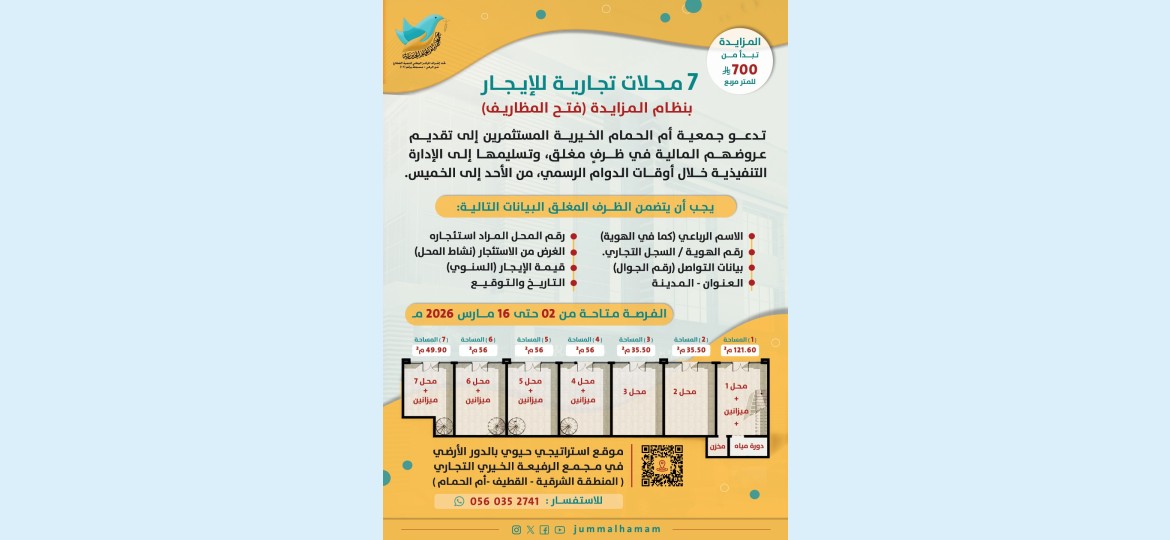 تعلن جمعيّة أمّ الحمام الخيريّة عن طرح (7) محلّات تجاريّة للإيجار في موقع استراتيجيّ حيويّ بالدّور الأرضيّ في مجمّع الرُّفَيْعة الخيريّ التّجاريّ الكائن في بلدة أمّ الحمام بمحافظة القطيف، وذلك بنظام المزايدة (فتح المظاريف)، حيث تبدأ المزايدة من (700) ريال للمتر المربّع.