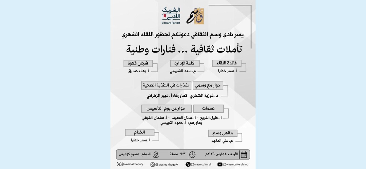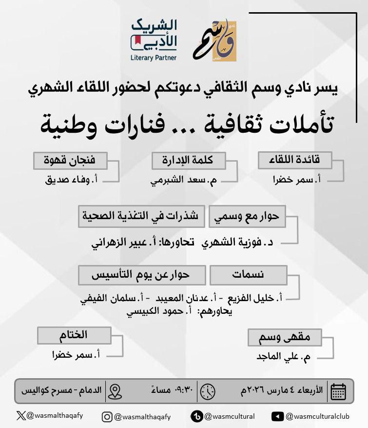 يستعد  نادي وسم الثقافي  لإقامة لقائه الشهري بعنوان «تأملات ثقافية… فنارات وطنية»، وذلك مساء الأربعاء 15 رمضان 1447هـ الموافق 4 مارس 2026م، عند الساعة 9:30 مساءً، على مسرح مسرح كواليس، في أمسية ثقافية تجمع بين الحوار الوطني والطرح المعرفي في أجواء رمضانية مميزة.