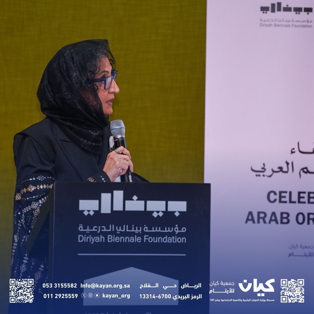ثم بينت الأستاذة (ندى القنبيط) المدير التنفيذي بجمعية كيان في كلمتها أن الجمعية تحتفل بيوم اليتيم العربي هذا العام في أجواء مختلفة وملهمة، وذلك في ساحات معرض «في الحلّ والترحال» الذي تستضيفه مؤسسة بينالي الدرعية، حيث يقدم المعرض رؤية فنية ترى العالم مساحة دائمة التحول والتطور.